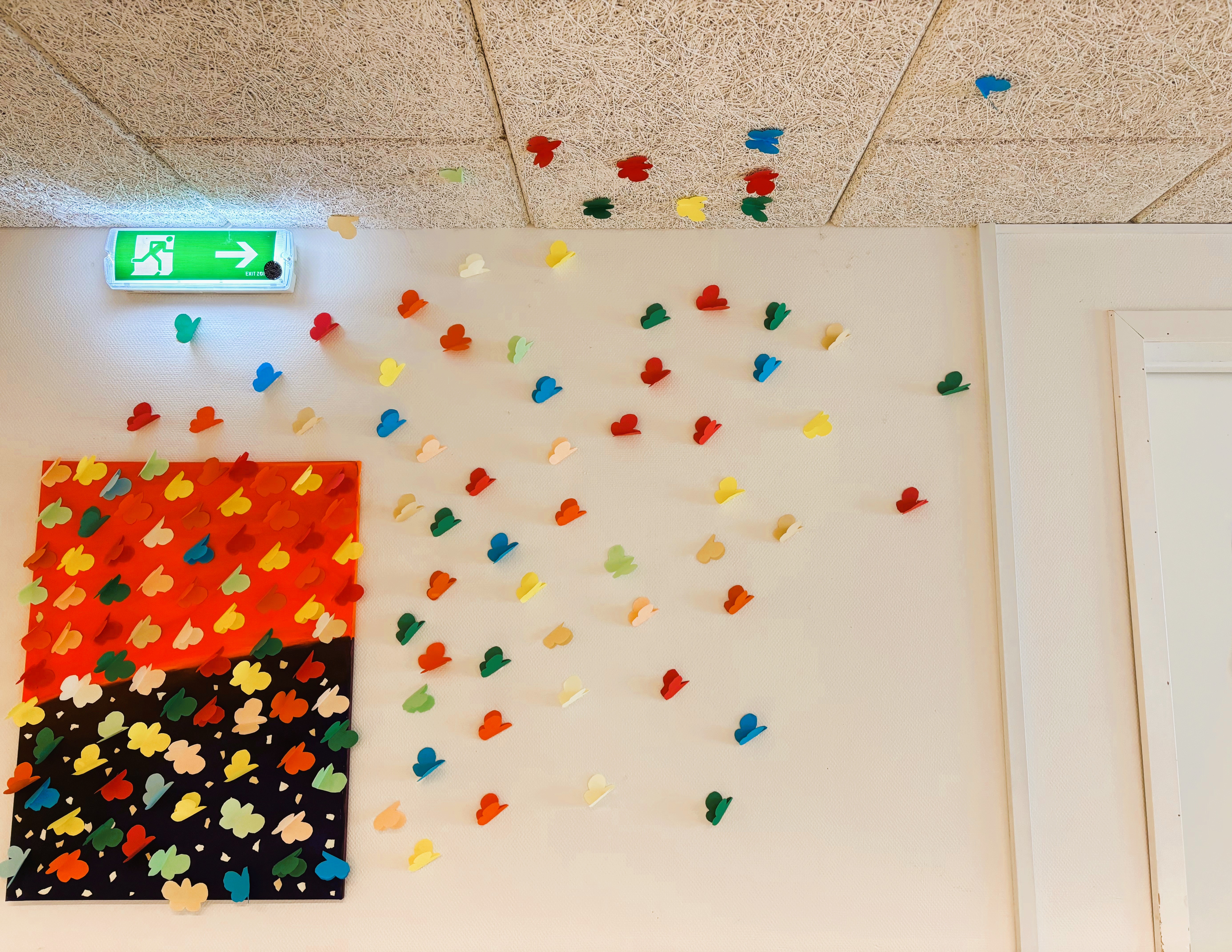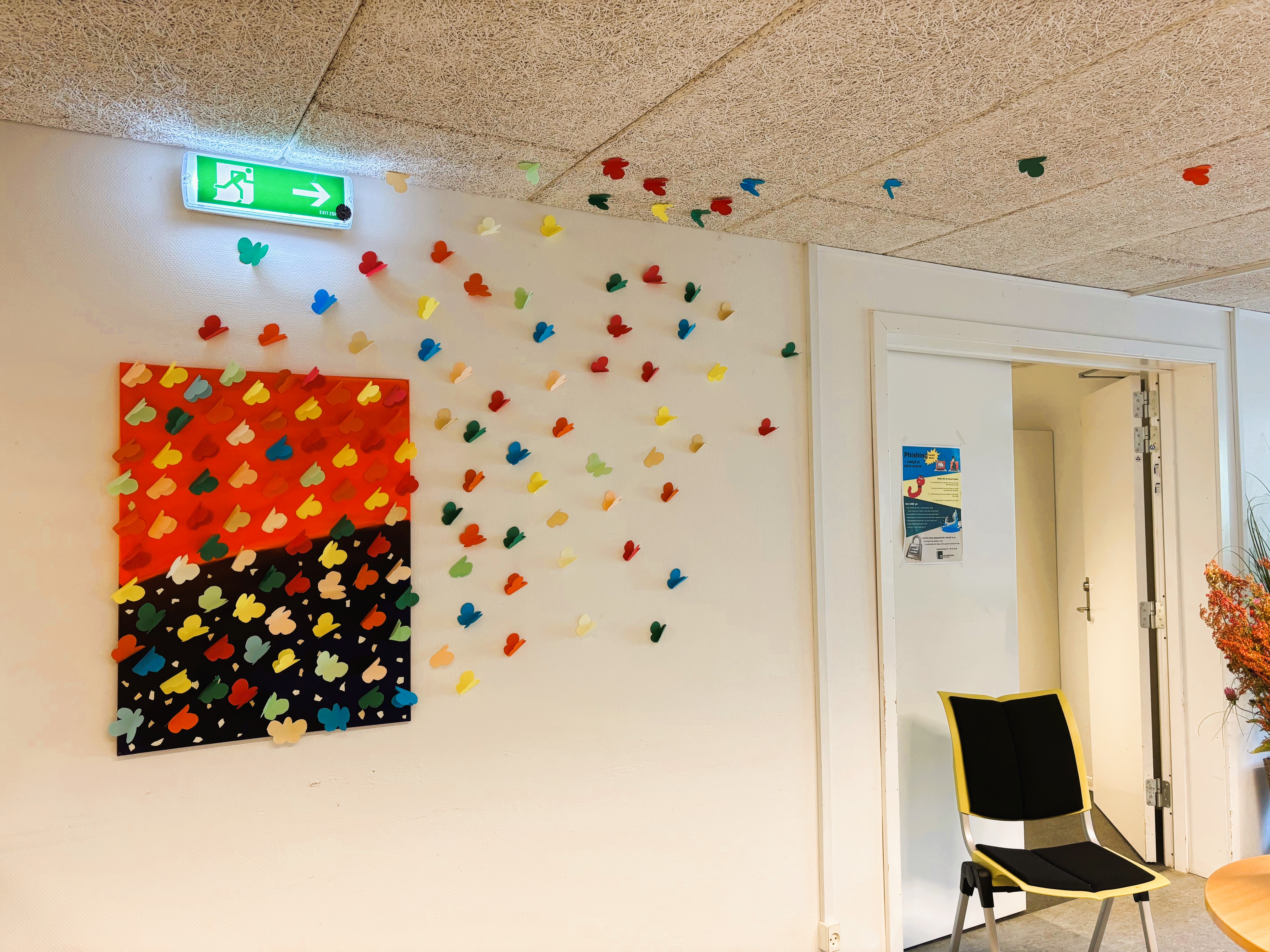 Kreaholdet har arbejdet differentieret med opgaven om at forskønne skolen. Opgaven udviklede sig på tværs af holdene, og endte ud i dette effektfulde kunstværk, som kan tolkes ud fra flere parametre - men som først og fremmest giver en livlig og glædelig velkomst i vores indgang, når vi møder om morgenen.